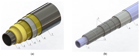 A large number of cryogenic pipelines [21,22,23,24] were developed decades ago. Such pipelines used to consist of a carrier pipe and a casing with layered insulation containing an elastic adsorbent, the space between which was evacuated. Figure 1 shows the general design of such pipelines.