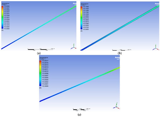 At the time of the preparation of the article, there was no reliable information on modeling the flow of LNG through pipelines with various types of insulation present. Therefore, to assess the adequacy of the model, the data for similar modeling, which had been performed for liquid nitrogen, were used. The graphs of temperature distribution along the pipeline also correspond to the theoretical expectations presented in other studies [40,41].