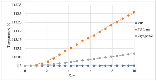 Figure 9 presents a comparative analysis of the LNG temperature distribution. According to the simulation results, it can be said that the temperature of LNG with VIP increases more slowly than for a similar one using aerogels and polyurethane foam insulation.