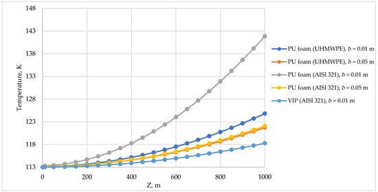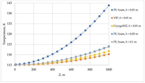The simulation of LNG flow in a UHMWPE pipeline with an external diameter of dext = 0.11 m and a wall thickness δ = 0.01 m (density: 930 kg/m3, heat capacity: 1900 J/(kg∙K), thermal conductivity coefficient: 0.3 W/(m∙K)) with a PU-foam insulation coating was performed in a similar manner. Figure 11 depicts the LNG temperature distribution along the length of the UHMWPE pipeline when different thicknesses of PU foam were used.