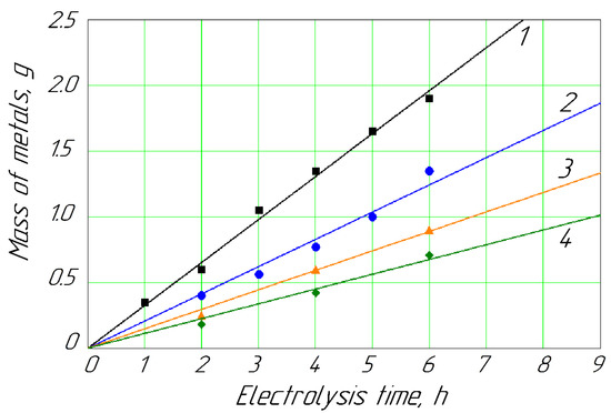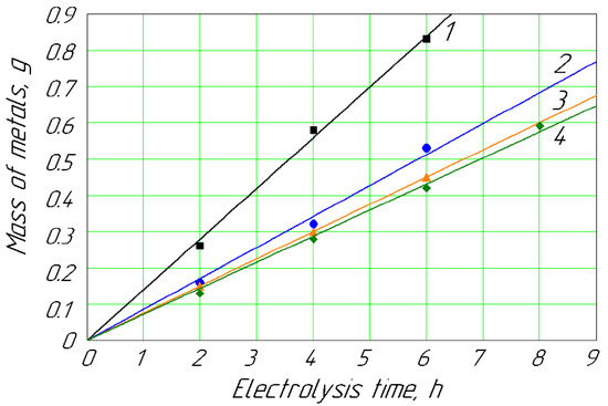 Additionally, for a further approximation of the experimentally obtained dependencies for the Cd and Zn masses deposited on the cathode, the following quadratic dependences were considered: