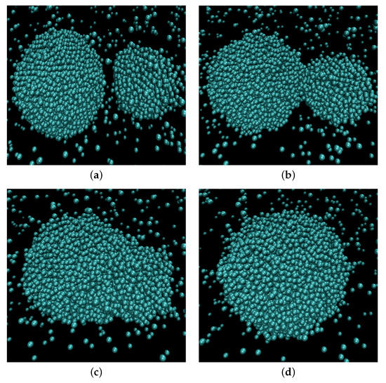 Molecular simulations can help bypass some of the restrictions faced by empirical models and provide more physical details, as they do not require any assumptions about the nature of the system beyond the molecular interaction potential and can capture processes on scales that are out of reach of the current experimental methods. Recently, Perumanath et al. [28] peeked into the initial stages of the coalescence process with MD simulations. While from the hydrodynamics standpoint, the moment of contact creates a singularity due to infinite surface curvature, MD allows inspecting this moment more carefully. The authors proposed that the contact between the two droplets is initiated by thermal fluctuations on their surfaces. As the droplets approach each other, the surface molecules in an area around the line of approach randomly start “jumping” across the gap due to thermal motion and proximity to the opposing surface. These “collective molecular jumps” constitute a new coalescence regime, which the authors call the “thermal regime,” preceding the hydrodynamic regime described above. This regime holds until the bridge radius grows to a certain threshold value proportional to the width of the contact area on the surface, i.e., the area from which spontaneous molecular jumps can occur. MD is also used in the studies of more complicated cases of droplet collision, e.g., the collision of conducting droplets in an electric field [29]. In this case, droplets deform into a conical shape as they approach each other due to the electrostatic force, and the outcome of the collision depends on the cone angle and the critical electrical field strength. Nanoparticles covered by an adsorbed liquid-like film also show a bridge formation and growth that results in an effective attraction between them, although they cannot coalesce [30]. Another example is the recent study of the coalescence/sintering bifurcation phenomenon for nanoparticles [31]. With the help of isothermal MD simulations, the authors discovered that the temperature of the transition from sintering to coalescence for Au nanoparticles is lower than the nanoparticle melting point. In the vicinity of that critical temperature, the child particle can have either a crystalline structure or a liquid-like structure at the same temperature.