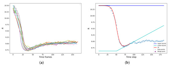 (a) Gyration radius of the composite droplet as a function of time for 10 simulations of configuration (0.65, 7.0, 10.0). The sharp exponential drop corresponds to coalescence, followed by fluctuations around the “equilibrium” value. (b) Demonstration of the coalescence time approximation procedure.