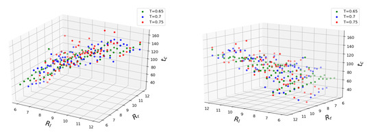 The droplets are composed of Lennard–Jones (LJ) molecules. The LJ model is widely accepted for fluids with van der Waals interactions and quantitatively describes noble gases, nitrogen, and methane [32,33]. When working with the LJ potential, it is convenient to use the so-called reduced units, in which distances, masses, and energies are multiples of the parameters of the LJ potential (the effective molecular diameter), (the molecular mass), and (the depth of the LJ potential, that is the minimum energy of interaction between two LJ particles), respectively. The density is the number of LJ particles per volume equal to the cube of the effective diameter , thus in a simple cubic lattice, where the neighboring particles contact each other. All the values below are given in reduced units if not stated otherwise. The potential is cut and shifted at . Critical properties for such system are and [34,35]. Three temperatures were considered: , 0.70, and 0.75. The corresponding saturated vapor densities, pressures, and viscosities are shown in Table 1. The rectangular simulation box has dimensions of , and for the three temperatures, correspondingly. Periodic boundary conditions are applied to ensure constant volume and the number of LJ particles. Droplets are generated as spheres filled with LJ atoms arranged in face-centered cubic lattices and placed at a distance of between their surfaces. This arrangement ensures that coalescence does not start right away, but rather the system equilibrates for a while, and droplets come in contact naturally by drifting towards each other due to the dispersion attraction. The moment of contact was determined using a clustering algorithm adopted from [36]. Initial radii of droplets span from 6.0 to 12.0 and vary by 0.5 steps. In the initial configuration, the droplets are aligned along the x-axis, and the left droplet is smaller or equal in size to the right one. In every particular simulation, the configuration is characterized by three parameters , where T is the system temperature, is the radius of the smaller (left) droplet and is the radius of the larger (right) droplet, e.g., (0.65, 7.0, 10.0) corresponds to a configuration of temperature 0.65 and initial droplet radii of 7.0 and 10.0 . Initial velocities of the molecules are randomly generated according to the temperature. One hundred simulations for each parameter set are performed to collect statistics. The necessity to conduct a large number of simulations to collect reasonable statistics prevents simulations of larger droplets due to computational expenses.