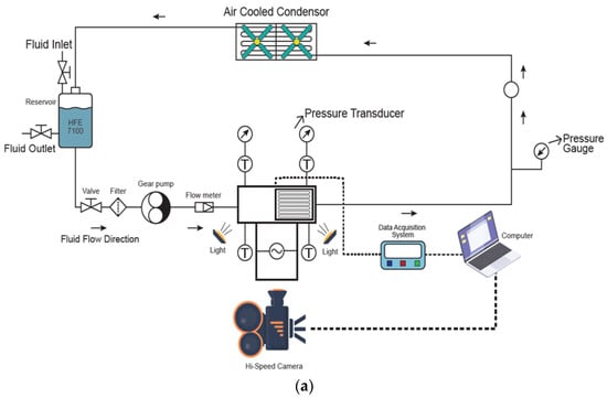 This study was conducted by conducting a set of experiments in a facility presented in Figure 1. The facility comprised several key components, including an evaporator, condenser, reservoir, pump, piping system and data acquisition system. The experiment was performed by pumping the working fluid through the evaporator with a controlled gear pump. The test sample (microchannel) was placed inside the evaporator to represent the real heat flux in the industrial application. The boiling phenomenon was then captured by a set of sensors and a camera for visualisation.