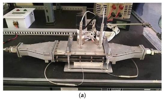 The evaporator, where the test sample was attached, consisted of some main parts, as shown in Figure 2. It had total dimensions of 474 mm (le) × 4 mm (we) × 48 mm (he) and channel dimensions of 60 mm (wc) × 18 mm (hc). To mimic the heat flux from the industrial application, total power of 2100 W was installed under the heating block. The supplied heat was controlled by a voltage regulator and monitored by a watt meter. Six k-type thermocouples were attached close to the surface of the heating block to estimate surface temperature. Meanwhile, two other k-type thermocouples used to measure fluid temperature were attached to the top of the channel. Furthermore, two pressure transducers were placed close to the inlet and outlet of the channel to measure the pressure drop caused by the system. Additionally, a transparent window was installed to observe and visualise the bubble dynamics during the experiment.