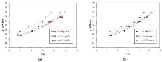 where is the average boiling heat transfer coefficient, is the net heat flux applied to the channel, is the fin surface temperature, and is the saturation temperature of the working fluid. The result of this calculation is presented in Figure 5.