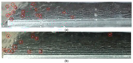 To provide a better understanding of the boiling phenomenon in the channel, the visualisation of the bubble dynamics during the boiling process is discussed in this section. As the free stream flow hits the leading edge, the thermal boundary layer grows. As the temperature increases up to the saturation temperature, the phase-change occurs on the surface, leading to bubble generation on the active nucleation site. Equally important, the bubble nucleation is strongly affected by the test condition, and the present study reveals that the phenomenon is more pronounced in higher heat transfer coefficient cases (R1 and T1). From Figure 7, it can be observed that bubble dynamics are affected by the surface geometry and fluid flow rate. The comparison between R1, R2 and R3 surfaces at 170 W heat input shows that the R1 surface had the highest number of bubbles and detachments compared to the other surfaces. This observation is consistent with the higher heat transfer coefficient of the R1 surface, as discussed in Section 3.1. However, it is worth noting that at lower fluid flow rates, the bubble population on the surface appeared to be more crowded, which could cause a reduction in heat transfer performance due to the thermal resistance from the vapour. This effect was more pronounced in the R3 surface, which had the lowest heat transfer coefficient among the three surfaces due to the inability to detach the heat by the evaporation process. This indicates that the heat transfer coefficient has a direct influence on bubble dynamics during the boiling process.