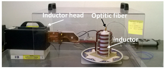 The nanofluids were heated by means of an inductor connected to a generator EASYHEAT 10.0 kW (manufactured by Ambrell Corporation, Rochester, NY, USA) that generates a time-varying magnetic field at 177 kHz or 245 kHz. The cylindrical inductor in air was formed by 7 turns with an internal diameter of 8 cm. The supply current was varied between 100 A to 500 A which corresponds to a magnetic field between 4.5 to 21.0 kA/m (between 56 and 263 Oe) [60,61]. The temperature of each sample was recorded for different values of magnetic field amplitude and frequency. Temperature measurements were repeated more than three times. The measurement set-up is represented in Figure 1 [61].