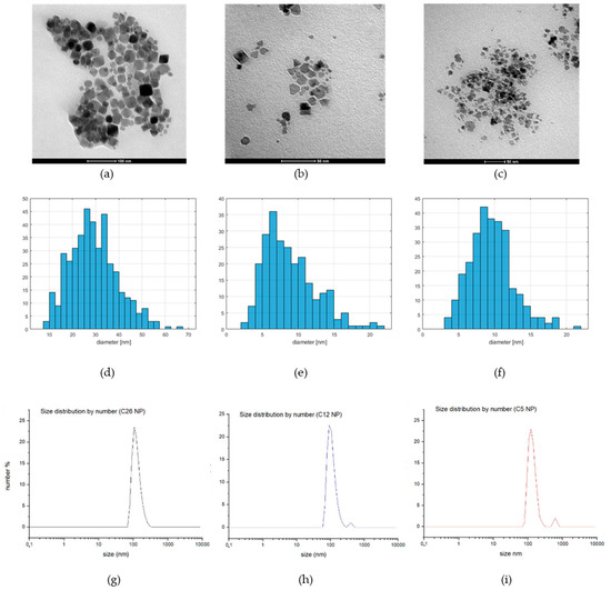 (a–c) TEM of the nanoparticles, (d–f) the histograms of the diameter, and (g–i) representative size distribution profile by number measured by Dynamic Light Scattering: (a,d,g) Iron-Mn sample, C26, (b,e,h) thermal decomposition Iron-Oxide sample, C12, (c,f,i) coprecipitation Iron-Oxide sample, C5.