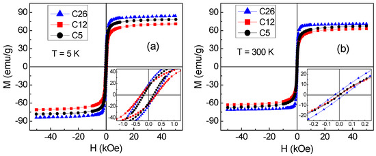 Magnetic loops measured on the three samples at T = 5 K (a) and T = 300 K (b). The insets are zoomed views of the central region of the loops.