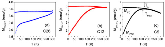 Other features revealing that interparticle dipolar interactions affect the magnetic relaxation of the nanoparticles are: (i) the trend of MFC, which tends to become constant below Tmax; (ii) the observation that, in spite of the wide size distribution of the C12 and C5 MNPs (Figure 3f,g), Tirr is very close to Tmax because magnetic interactions act so as to narrow the distribution of effective anisotropy energy barriers, being the relaxation of the MNPs no longer fully independent [74]. However, Figure 5b,c confirm that the C5 and C12 MNPs are in the full superparamagnetic state at T = 300 K, in agreement with the null values of coercivity and remanent magnetization (inset of Figure 4b).