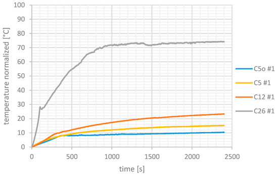 Figure 6 shows an example of a typically normalized temperature increment as a function of the time related to the different nanofluids analyzed at a given frequency and magnetic field intensity. The temperature was acquired up to 2400 s (40 min) and in this acquisition interval, it arrives at a Tmax value. At around 100 s, the C26 curve experiments with a modification of the slope in the heating curve, and a small peak is visible. This could be due to the deposition of the fluid in the bottom of the vial. Then only half of the first-time interval, (up to 100–120 s) could be used to evaluate SLP using the slope method. Consequently, for this sample, an interval of 60 s could be adequate to evaluate SLP. This phenomenon was less visible for the C5 and C12 nanofluid samples at around 300–400 s. The observation of the behavior of curves in Figure 6 and the determination of the approximated time constant of the exponential suggested the amplitude of the quasi-adiabatic interval characteristic of each nanofluid. Table 4 reports the SLP evaluated by means of the three computation methods expressed by Equations (1) and (2) and QA-SLP for three different temperature-time curves. The temperature was recorded on a time interval of 2400 s applying a magnetic field at 177 kHz with a maximum value of 170 Oe. All the curves reach the limit temperature at a steady state. The measurements were repeated three times and the average SLP was computed for each NP sample. The temperature values were normalized to the initial temperature then Figure 6 represents the temperature increment with respect to the initial temperature.