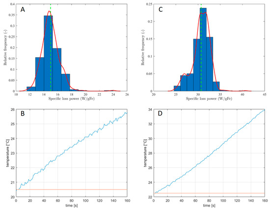 Figure 7 and Figure 8 show the SLP histogram evaluated using QA-SLP and the temperature as a function of the time in the measurement interval between 0 and 160 s for the samples C5 (Figure 7A,B), C12 (Figure 7C,D), and C26 (Figure 8C,D). All the samples were dispersed in water, and they are heated by applying a magnetic field of 227 Oe at 5 kHz. Figure 8A,B refer to sample C26 where the water dispersed when the time-varying magnetic field amplitude is 170 Oe. In particular, the data in panels (C,D) in Figure 8 related to sample C26 show a double slope. After 120 s and 80 s sample experiences, first, faster heating was followed by a temperature decrement and a different slope of the temperature as a function of time. The new temperature slope is lower with respect to the one at the magnetic field turn-on. In fact, in this time interval, NPs deposed on the vial bottom, then the suspension fluid heating is related to a heating source (NPs) more concentrated than by heating the fluid by convection.
