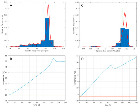 Histogram of the SLP values evaluated in a 10–100 s time interval and corresponding temperature measured in an acquisition 160 s long. Value for the sample Iron-Mn sample, C26, water dispersed considering a magnetic field (A,B) at 177 kHz with magnitude 170 Oe, and (C,D) at 177 kHz with magnitude 227 Oe.