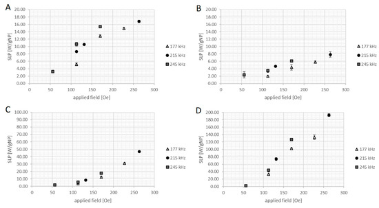 The SLP using adiabatic method was evaluated at 177, 215, and 245 kHz and considering different magnetic field intensities with peak-to-peak between 113 and 263 Oe (9 to 21 kA/m, peak value).