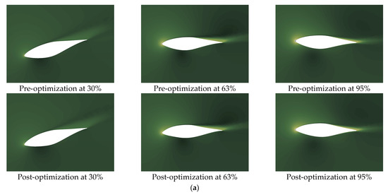 (a) Comparison of the cross-sectional shape profile before and after the optimization; (b) comparison of the values for the Cp before and after the optimization in terms of S4 (shape and dihedral).
