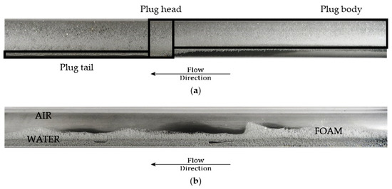 Examples of two foamy flow conditions (a) plug flow at JL = 0.03 m/s and JG = 0.41 m/s and (b) stratified flow at JL = 0.03 m/s and JG = 2.31 m/s (D = 60 mm).