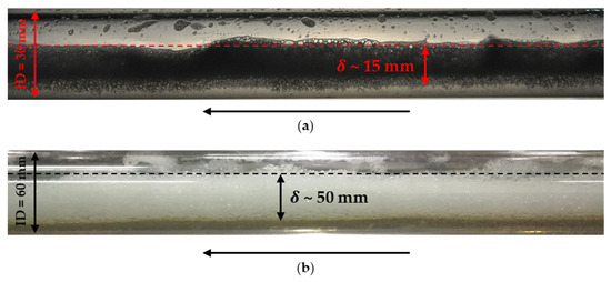 Accordingly, if , the foam layer is dragged similar to a solid object floating on the liquid, whereas if , a velocity profile develops. Approximate estimates of were obtained taking the experimental values of both the yield stress and the pressure gradient, leading to a range between 10 mm and 25 mm for the 30 mm ID pipe and between 50 mm and 60 mm for the 60 mm ID pipe, which seems consistent with visual observations of the foam layer thickness (see a typical case in Figure 4). In particular, the 30 mm ID pipe most often showed whereas for the 60 mm ID pipe, . This result is consistent with the outcome of the simulations.