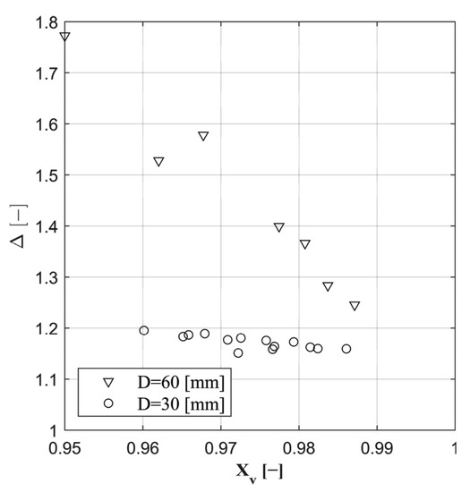 The result is shown in Figure 5, where Δ is reported against the volume quality. It is evident that a significant reduction of the liquid loading took place, which was, however, more evident in the 60 mm ID pipe characterized by lower phase velocities. In both cases, Δ decreased as the volume quality increased. This suggests that foam is more effective in reducing the liquid load at larger values of the water cut, which confirms the attractiveness of this deliquification technique. Accordingly, the percentage benefit (Δ 1) ranged between about 25% and 80% for the 60 mm ID pipe, whereas the 30 mm ID pipe showed lower values, in the range 15% to 20%.