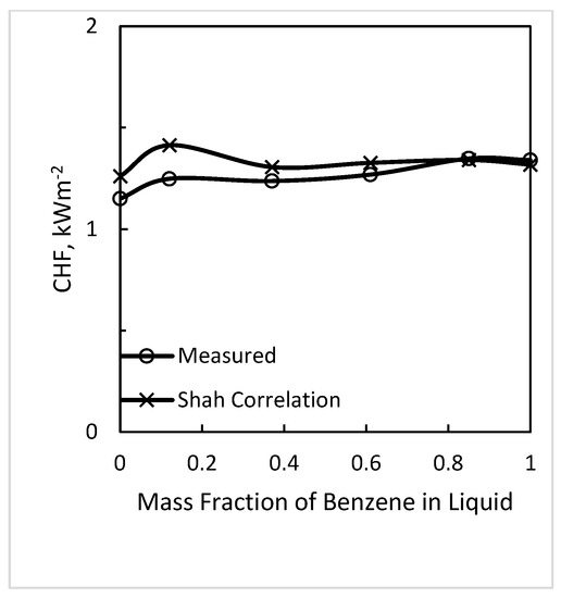 Figure 2, Figure 3, Figure 4 and Figure 5 show the variations of CHF as a fraction of the more volatile component of the mixture varies from 0 to 1. It is seen that in some cases CHF at some composition is a little higher than of either component, but the excess is small and is within the margin of experimental uncertainty. The predictions of the Shah (2015a) [27] correlation are always close to the measured values. As is seen in Figure 2, it also predicts a CHF higher than that of either pure component. So, the variations in CHF are accounted for by the change in properties with change in composition.