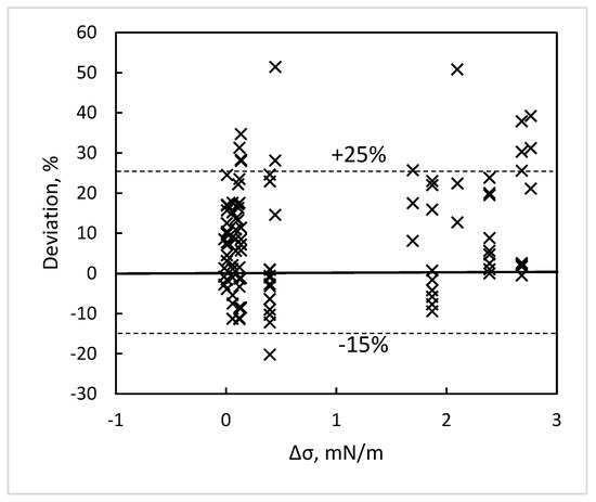 As seen in Table 1, Table 2 and Table 3, Δσ in the present data analysis varied from −0.02 to 2.8 mN/m, and data over the entire range are in satisfactory agreement with the Shah correlations. Deviations of the Shah (2015a) [27] correlation with annulus data are plotted against Δσ in Figure 6. There is no indication in it that deviations are related to Δσ. Deviations of a few data points are high at both small and large Δσ. All such data are for mixtures of acetone. Some data for pure acetone also had similar deviations. This behavior may be due to small amounts of impurities in acetone. No data other than those for acetone and its mixtures had deviations greater than 25%.