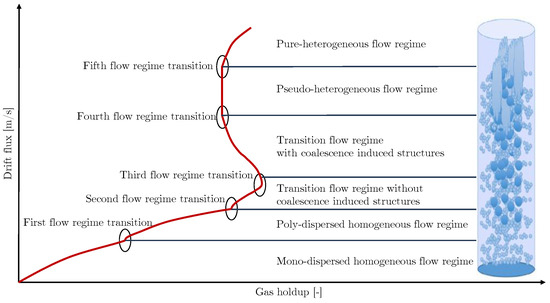 Finally, stable coalescence-induced structures emerge, leading to the pseudo-heterogeneous and purely heterogeneous flow regimes. The former is characterised by an equilibrium between the increase in the flow rate (in terms of drift flux) and the formation of coalescence-induced structures. This leads to constant holdup with respect to an increase in the drift flux, indicating that the coalescence-induced structures are well established. On the contrary, in the pure-heterogeneous flow regime increasing the gas flow rate increases coalescence-induced structures, and the increase in drift flux is followed by an increase in the gas holdup; for more details, see the paper by Besagni (2020) [7].