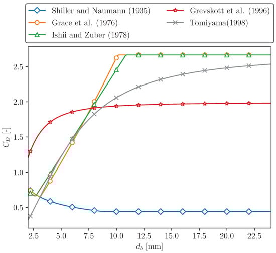 A popular correlation suitable for gas–liquid flows with a range of shapes was derived by Tomiyama et al. (1998) [19]. The proposed drag coefficient consists of three equations, respectively corresponding to pure, slightly contaminated, and fully contaminated systems: