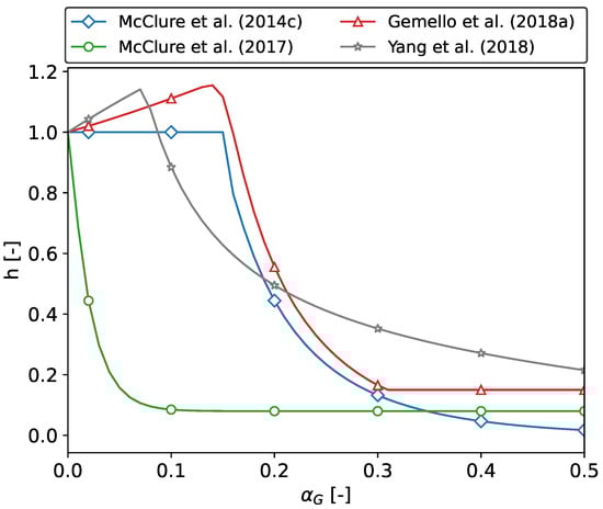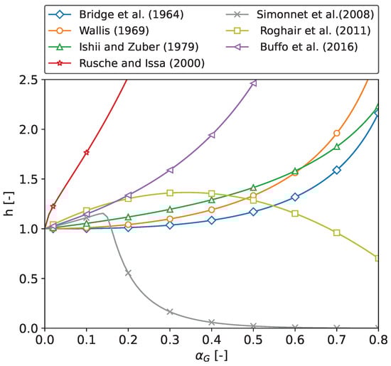 Gemello et al. (2018a) [30] modified the correlation proposed by Simonnet et al. (2008) [27] (validated for ) to obtain a swarm factor feasible for a wide range of operating conditions. In particular, they noted that the decrease in the swarm factor proposed by Simonnet et al. (2008) [27] is too strong for high volume fractions; thus, they added a minimum asymptotic value () towards which h should tend at high void fractions: