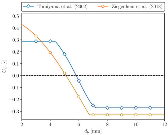 - Ziegenhein, T.; Lucas, D. The critical bubble diameter of the lift force in technical and environmental, buoyancy-driven bubbly flows. Int. J. Multiph. Flow 2019, 116, 26–38. [Google Scholar] [CrossRef]