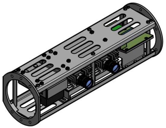 High temperatures are observed on the single-board computer’s CPU and on the selected industrial video cameras’ housing during the TSS programs operation. To solve this problem, the heat is removed by using heat sinks on the external housing of the compartment in order to lower the temperature at the expense of the surrounding water environment temperature. In addition, an air cooling system is used to create air circulation inside the compartment so that its temperature is evenly distributed and also lowered by the temperature of the compartment case (Figure 4).