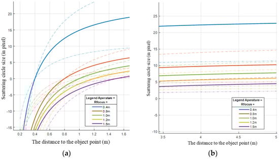 Figure 5 shows image blur calculations at different focus distances of 0.4, 0.8, 1.0, 1.2, and 1.5 m, and different aperture sizes of F1.4 (dotted line), F2 (continuous line), and F4 (dashed line).