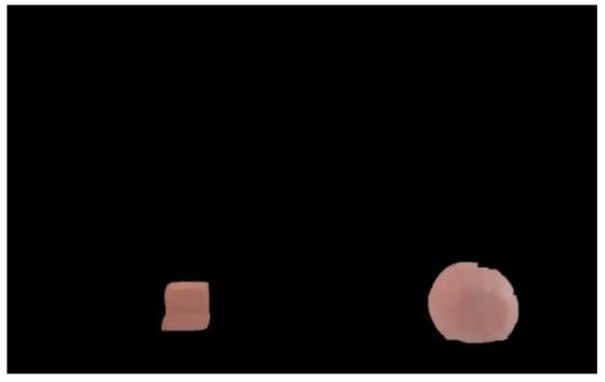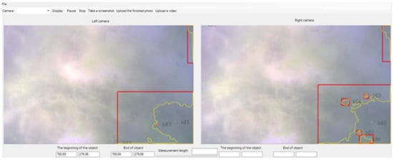 As mentioned above, Basler matrix cameras are used. Since the Basler Pylon camera software package for Linux ×86 (64-bit) is offered in installation package format for Debian and similar Linux distributions (e.g., Ubuntu) and in tar.gz package for all other Linux distributions, Debian 11 with its low CPU and RAM requirements is chosen as the operating system. Debian consists of an up-to-date Linux kernel with long term support and “free” software components. Together, this makes it possible to use Debian 11 on a PC as the operating platform for the task at hand. The implementation of the algorithm of the developed method for image reconstruction is made in C++ and is intended to be run under the Linux operating system. The program supports an interactive user interface with the ability to visually display the processed video stream from the cameras with the ability to visually demonstrate the detected objects (Figure 6). Processing is carried out for each frame coming from the cameras. In order to unload computing power, the object is first searched by the contour method in 2D, and then the 3D coordinates are searched in the found area.