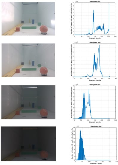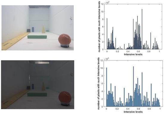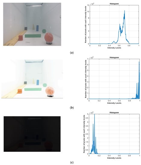 In Equation (5) n and m are the dimensions of the brightness matrix, —is the considered matrix element. Figure 8 shows the pixel brightness distributions for the brightness levels of different test pictures. When the illumination changes, the histogram is completely distorted. In Figure 8c, it can be seen that for the darkened image, the brightness index on the graph is strongly shifted towards the minimum brightness values. In this way, the algorithm allows us to determine how good the images obtained are.