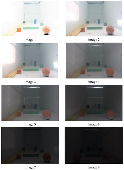 where Y is the resulting brightness of the image, the values of which are represented as one byte and denoted for convenience by integers from 0 to 255 inclusive, where 0 is the minimum and 255 is the maximum intensity, and where R, G, B are the channels of the RGB color model. At present, the formula for calculating the overall brightness of the resulting image has received a more accurate representation, but in order not to increase the computational load, it is sufficient to use the form (11). To illustrate, let us take eight identical scenes made in a laboratory aquarium, but with different lighting, and calculate the brightness of each scene (Figure 20).