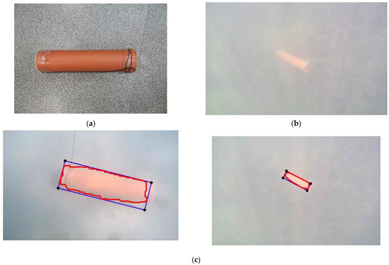 The proposed algorithms also apply to the search for more complex objects under water, including artifacts. An example of such objects is shown in Figure 26. The application of the contour method for localization of the object allowed using the algorithm for searching 3D points only in the area of interest of the image, which, in turn, accelerated the execution of the algorithm several times by reducing the area of definition of 3D points.