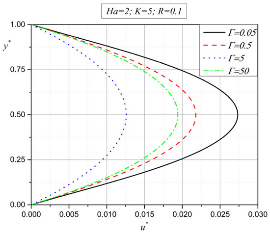 An increase in the additional viscosity gamma () leads to a decrease in temperature in the middle of the channel (Figure 4). As a consequence of a decrease in velocity and microrotation with an increase in the spin gradient viscosity parameter , Joule heating in the middle of the channel decreases. An increase in temperature near the plates, on the other hand, happens due to the viscous heat.