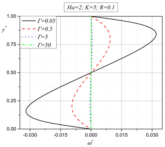 From Figure 2, it can be noted that the velocity decreases with an increase in the spin viscosity parameter from the value of to . However, at the same time, with a further increase in the spin gradient viscosity parameter (), the velocity starts to increase. This means that the velocity function has reached its extreme for a value of the spin viscosity parameter between and . Figure 3, which represents the influence of the spin viscosity parameter on the vector of microrotation, shows that a decrease in the absolute value of microrotation occurs in the entire height of the channel with an increase in the spin viscosity parameter . Both figures show that with an increase in the additional viscosity gamma (), the motion characteristics of the micropolar fluid start to decrease. This is the expected phenomenon of the viscous braking of the fluid flow, which is a consequence of the increase in the total viscosity of the fluid.