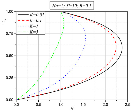 From Figure 16, it can be noted that for smaller values of the porosity parameter , viscous heating increases the temperature near the plates, while Joule heating increases it in the middle of the channel. However, for larger values of the porosity parameter (), Joule heating in the middle of the channel becomes dominant, as viscous heating near the plates starts to decrease.