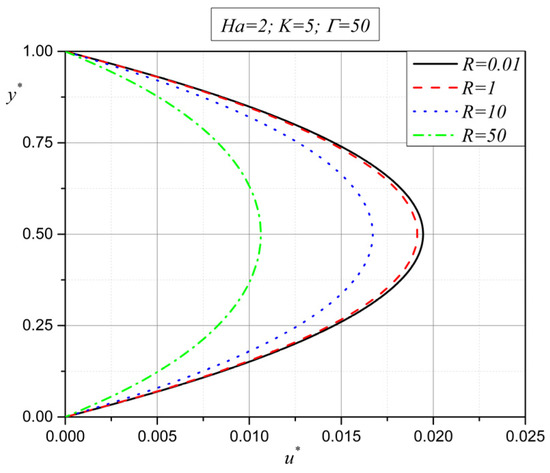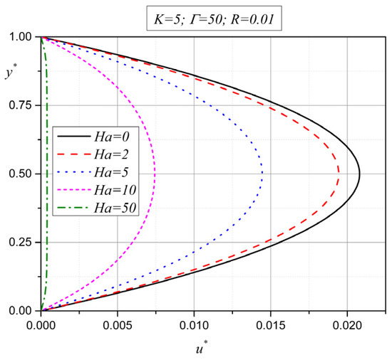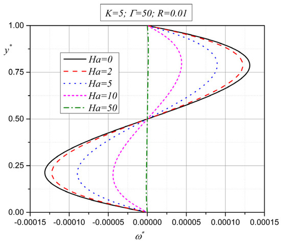 From Figure 8 and Figure 9, it is obvious that the velocity and microrotation decrease in absolute value as the Hartmann number increases [40,41]. This means that the motion characteristics of the micropolar fluid become lower in the entire width between the plates with an increase in the external magnetic field. This is something that is expected, as, with an increase in the external magnetic field in electrically conducting fluids, the Lorentz force acts in the direction opposite to the fluid flow and tends to retard the flow. It is very interesting to consider this through the roots of characteristic Equation (20), given by expression (21). In the previous section, it is determined that the value of expression depends on the physical properties of the fluid ( the strength of the external magnetic field , the permeability of the porous media and the distance between the plates . It is shown that with a change in the intensity of the external magnetic field , there is a change in the value of expression (it becomes positive, negative or equal to zero), which means that the tendency of the velocity or microrotation vector, for certain fluids, can be determined simply by knowing the change in the value of expression .