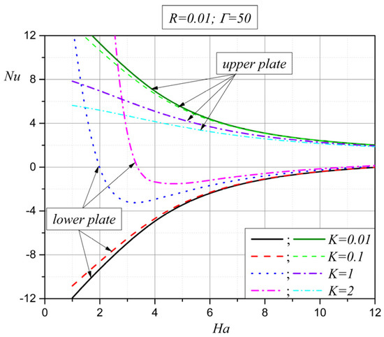 The next figure, Figure 11, shows the behavior of the Nusselt number on the lower and upper plates for different values of the Hartmann number (Ha) and coupling parameter (K). For the lower as well as for the upper plate, the Nusselt number decreases in absolute value with an increase in the Hartmann number, which is expected in the case of the Hartmann flow, as heat transfer is mainly in the form of conduction. This is the consequence of the dominant influence of the magnetic field. On the other hand, for larger values of the coupling parameter (K), heat transfer on the plates is lower, and this is due to an increase in the additional viscosity lambda (), which is characteristic for micropolar fluids.