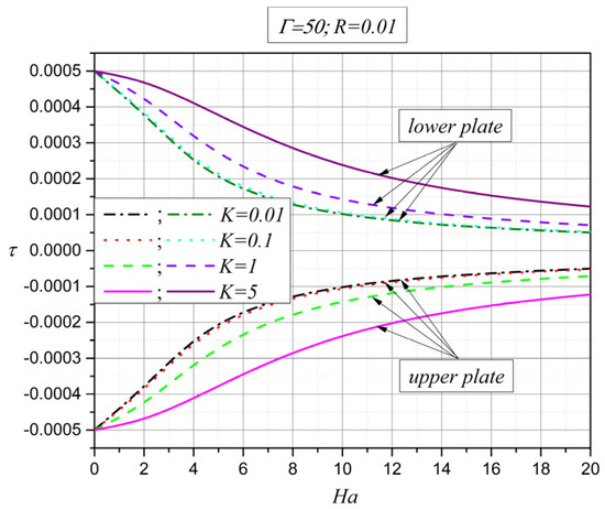 The influence of the external magnetic field and additional viscosity lambda on shear stress is presented in Figure 12 [42]. The increase in the Hartmann number causes a decrease in shear stress in absolute value, both on the lower and the upper plates. As expected, for higher values of the Hartmann number, the Lorentz force decreases the velocity in the entire width of the channel (Figure 8), and because of this, the shear stress becomes lower on the plates. In the other case, with an increase in the additional viscosity lambda (), which implies an increase in the coupling parameter (K), based on expressions (11), shear stress increases as the total viscosity of the fluid increases (the interpretation based on Equation (31)).