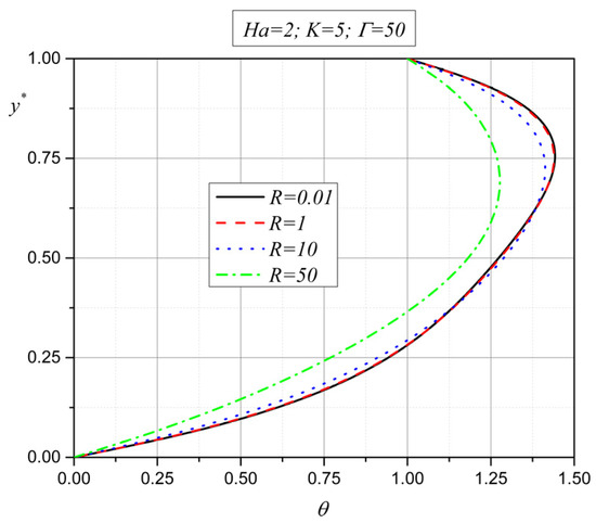 Figure 7 shows the influence of the coupling parameter on the dimensionless temperature. With an increase in the coupling parameter , conduction becomes the dominant form of heat transfer. This is also the consequence of the velocity decrease with an increase in the additional viscosity lambda (), which has already been explained in Figure 5.