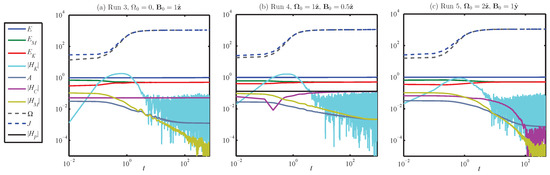 Figure 8a,c represent a quasi-stationary coherent structure in the magnetofluid. This is, at first, surprising, but nonetheless, it occurs: ergodicity is dynamically broken for Case V, at least during transition to equilibrium; however, longer run-times (which are planned) are needed to examine behavior in equilibrium. At the largest length-scales, where