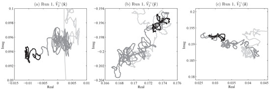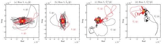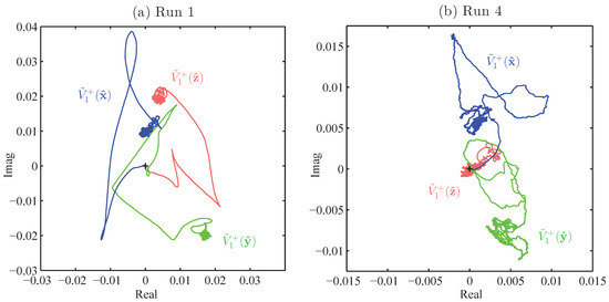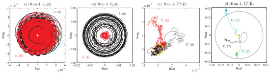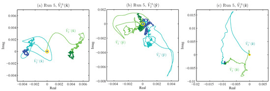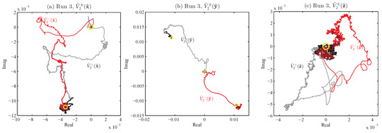 Figure 10. The yellow circles around the origin show the expected average magnitudes; in (a) and (b), these circles have also been placed around the ends of the trajectories, indicating that the fluctuation levels are as predicted, but the values are far from the predicted zero-mean, compared with the expected behavior seen in