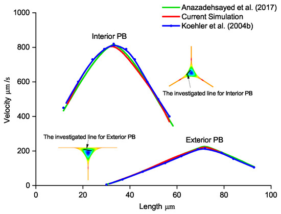 We also compared the flow in the PBs and nodes of our models using the experimental studies performed by Koehler et al. [37,38] and validation performed by [27]. Figure 4 shows the velocity of the flow inside the PB for the SDS foam. Our models and their experimental results for both the interior and exterior foams were consistent.