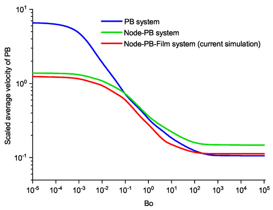 For the further validation of our models, we compared the velocity ranges of the node PB of our model to those in studies by Anazadehsayed et al. [27] and Nguyen et al. [8]. Anazadehsayed et al.’s [27] analytical results were based on a node–PB system; Nguyen et al.’s [8] results were based on a single PB system, and our results are based on an entire system containing nodes, PB, and a film. The three velocity ranges scaled by (Table 2) are shown in Figure 5. The results of our study were similar to those of Anazadehsayed et al. [27]. However, they were different from those of Nguyen et al. [8] for lower Bo values ( to ). This is owing to the inclusion of dissipation and resistance in each node [27]. Our results corresponded with those of Anazadehsayed et al. [27].