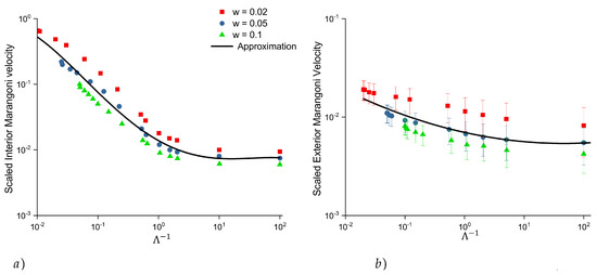 Following the works of Koehler et al. [5] and Anazadesayed et al. [39], both numbers and film thicknesses scaled by the inverse radius of curvature of the PB (Table 2) were combined with the new parameter , where w is the dimensionless thickness. Using this dimensionless value, which represents both the interfacial mobility and film thickness, a master curve was developed to determine the scaled Marangoni velocity for any given number and film thickness. As shown in Figure 9, the Marangoni velocity in the master curves decreased by increment. However, when the Bo number increased regardless of the film thickness, the Marangoni flow decreased. The scaled velocities of Marangoni flows in Figure 9 are sketched for both interior and exterior foams. However, the scaled Marangoni velocities for a range of collapsed well into master curves in the interior foam (Figure 9a). The master curves for the exterior foams (Figure 9b) had a larger gap between the Marangoni velocity profiles for different thicknesses. This velocity difference in the master curve was visible between the fitted line and lowest thickness. This may be attributed to the presence of a wall in the exterior geometry and surface-only feature of the Marangoni flow, as explained above. Hence, for the exterior foam (based on the results shown in Figure 9b), the gap should be considered for the prediction of Marangoni velocities, particularly for thinner films.