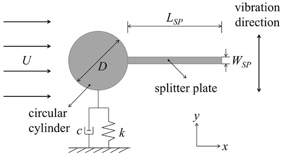 The problem investigated in this study is the one-degree-of-freedom vibration of an cylinder-plate assembly that is free to move only in the cross-flow direction (viz., along the y-axis). As shown in Figure 1, a rigid splitter plate with a length of LSP and a width is attached to the afterbody midpoint of a circular cylinder with a diameter D and oriented in the streamwise direction (viz., along the x-axis). The elastic spring supporting the cylinder is characterized by the spring stiffness k and a mechanical damping coefficient c. The uniform velocity of free stream is U. In our simulations, both U and D are assumed to be unity.