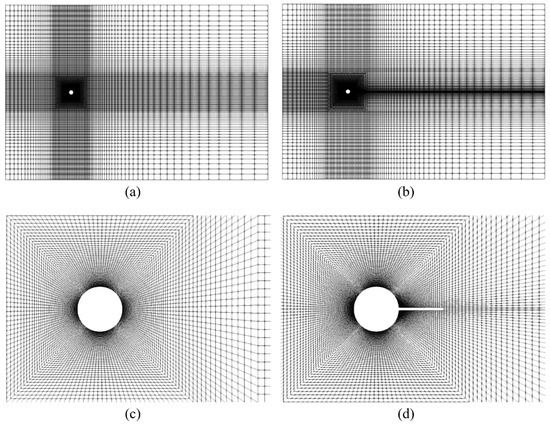 A grid sensitivity study has been conducted to ensure the numerical results are independent of the grid resolution. To simulate the VIV of a circular cylinder, a non-uniform stretched mesh composed of quadrilateral elements is used to tessellate in the entire computational domain (see Figure 3a,c). The mesh is characterized by the number of nodal points () along the circumference of the cylinder, the height of first grid layer away from the cylinder surface (), and the number of nodes along the radial direction within the dense mesh area surrounding cylinder (). More specifically, grid cells are distributed along the length of the splitter plate and three grid cells are distributed evenly along the width of the plate. Four different meshes ranging from coarse to dense are used in the sensitivity study—for each mesh, is fixed at in order to satisfy the criterion of (where is the normal wall coordinate, y is the distance from the wall, and is the friction velocity). The grid resolution is varied by changing the values of in the range from 80 to 200 and of in the range from 48 to 76—these variations change the total number of cell elements () in the mesh. In these numerical simulations, a computational domain size of and a time step of s are used.